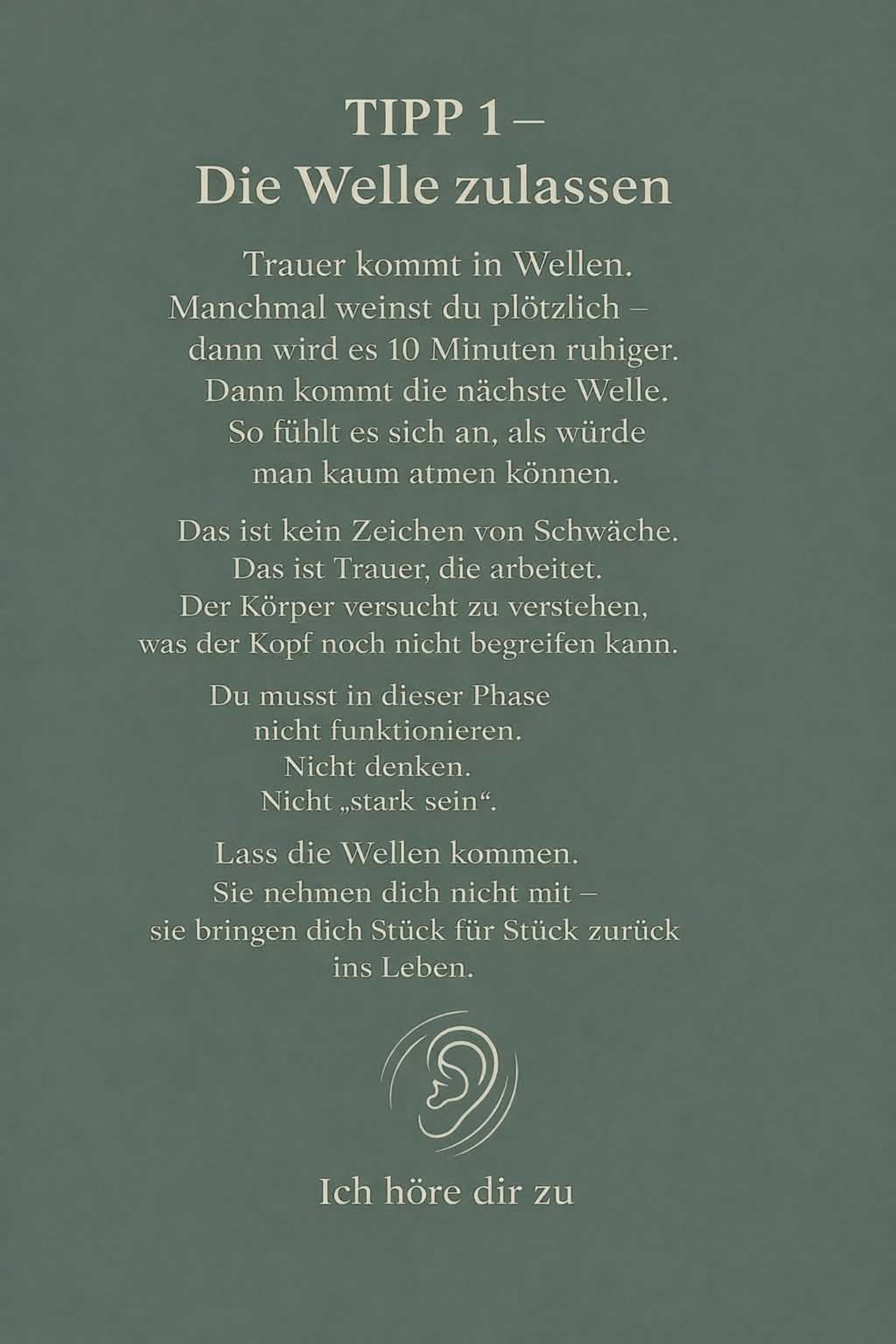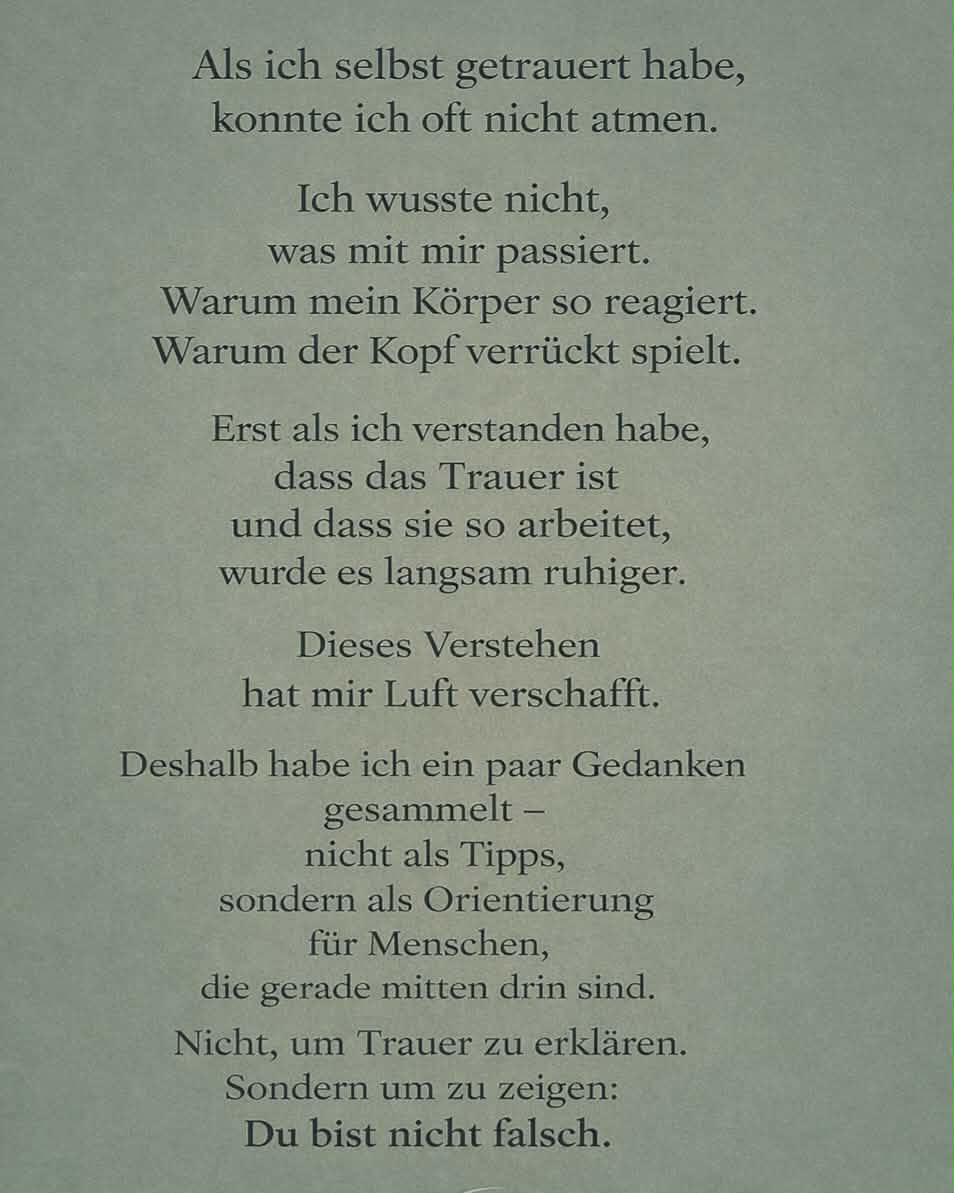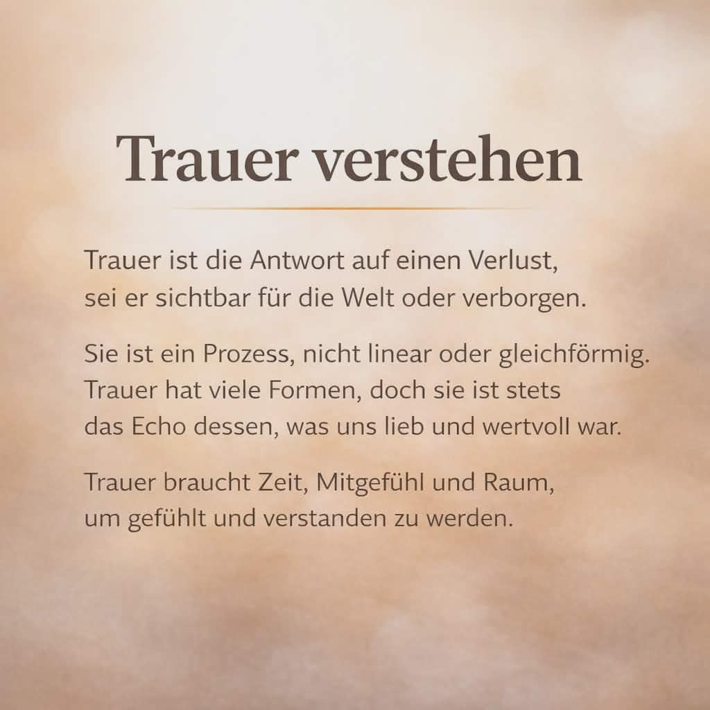 Hier darf alles da sein: Tränen, Wut, Leere, Erinnerungen. Schritt für Schritt, Atemzug für Atemzug – damit aus dem bloßen Aushalten langsam wieder ein Weitergehen wird. Nicht perfekt. Aber echt.